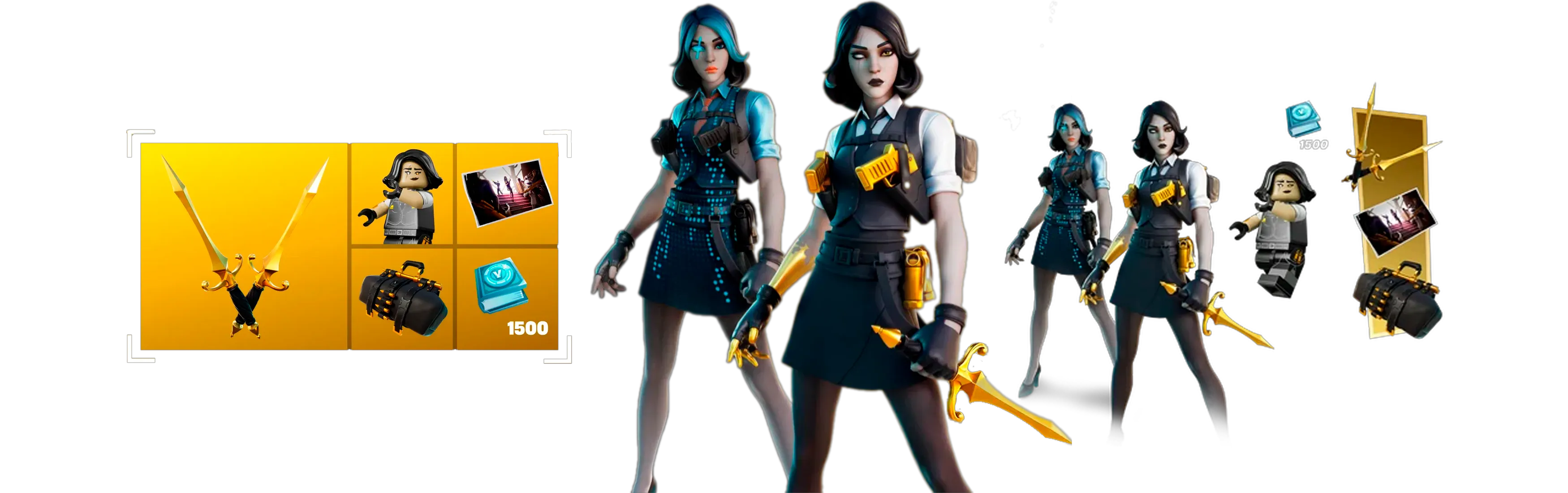 A mysterious villain with golden hands. The pack includes an outfit + LEGO® style, back bling, pickaxe, loading screen, and quests to earn up to 1500 V-Bucks.